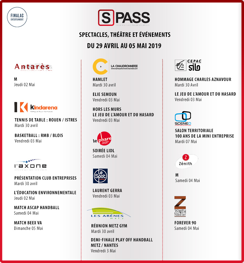 LES NEWS DU RÉSEAU // 29 avril au 5 mai 2019 Avr 24, 2019 | AGENDA Retrouvez ici tous les événements culturels et sportifs de la semaine, dans les salles animées par S-PASS TSE